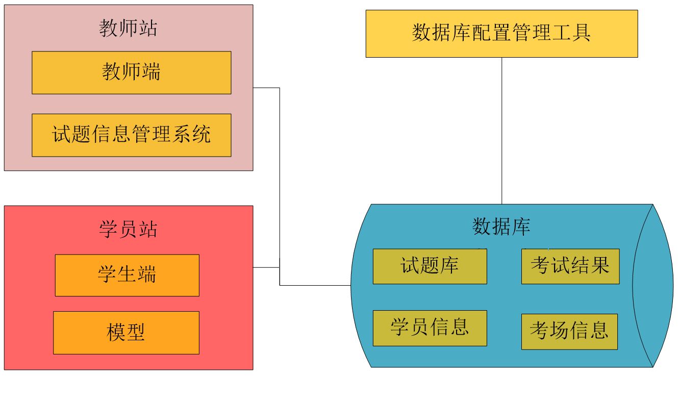 系統采用MySQL做為后臺數據庫,主要由教師端、學生端、試題信息管理系統和數據庫配置管理工具四個部分組成,各部分關系如下圖所示: